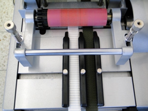 Der sichere und genaue Materialtransport ist durch gummierte bzw. gerändelte Transportwalzen gewährleistet, die beidseitig angetrieben sind. Der Anpressdruck der federnd gelagerten Walzen ist einstellbar. Um die Produktivität zu erhöhen können dem Schneidautomaten mehrere Gurte oder Bänder parallel zugeführt werden. Im Lieferumfang ist ein separater Materialrollenhalter enthalten.